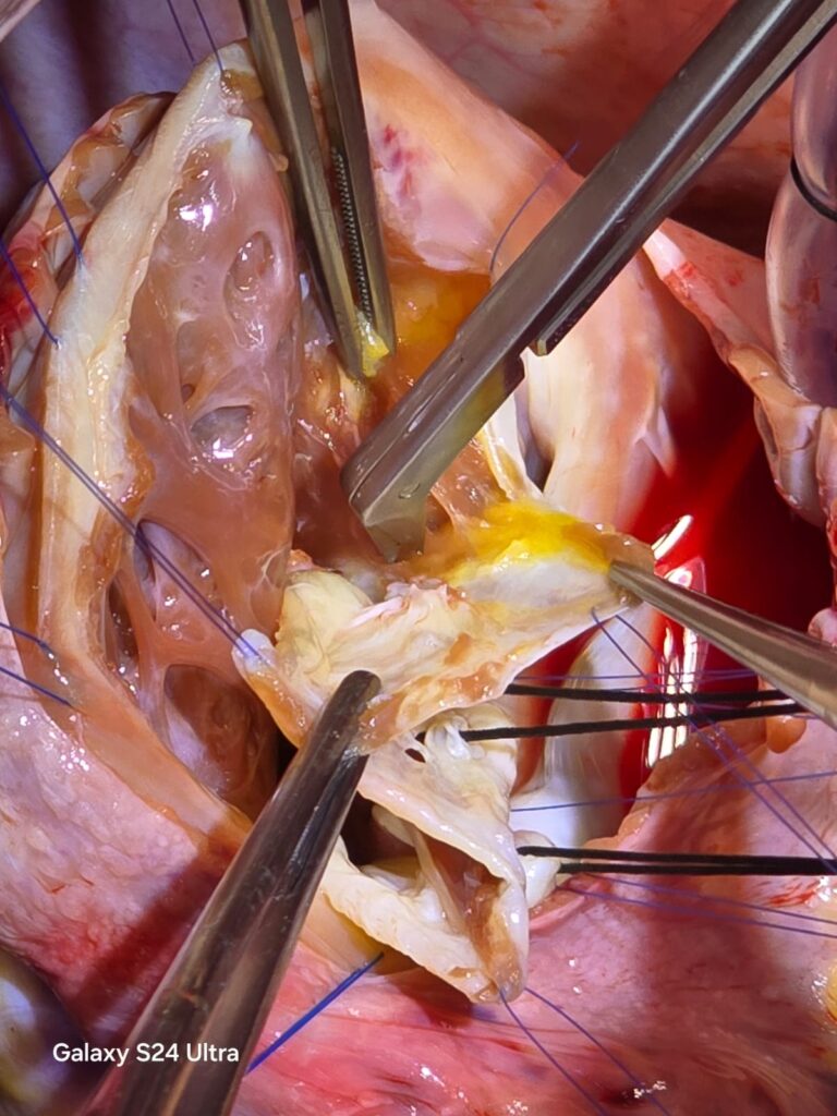 During the operation, the malformed valve leaflets were meticulously mobilised and reshaped into a cone-like structure before being reattached to the true valve annulus. This restored near-normal valve anatomy and function, effectively correcting the severe leakage while preserving the patient’s natural valve tissue.